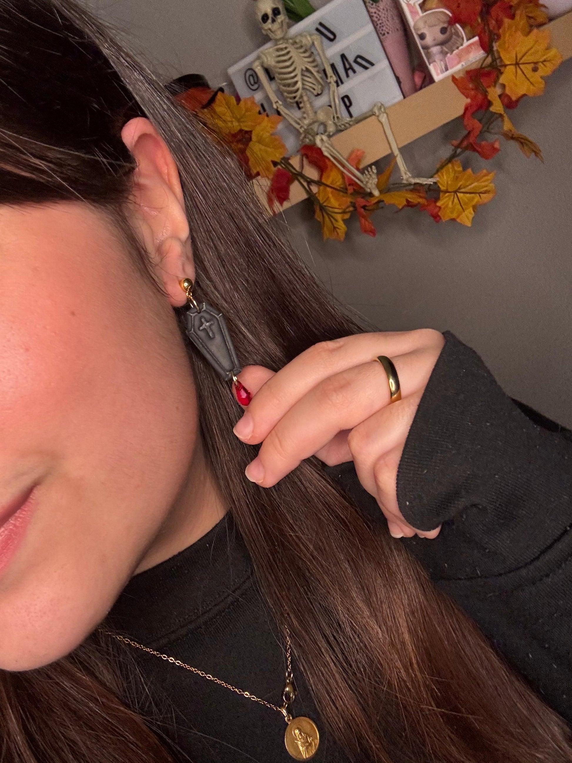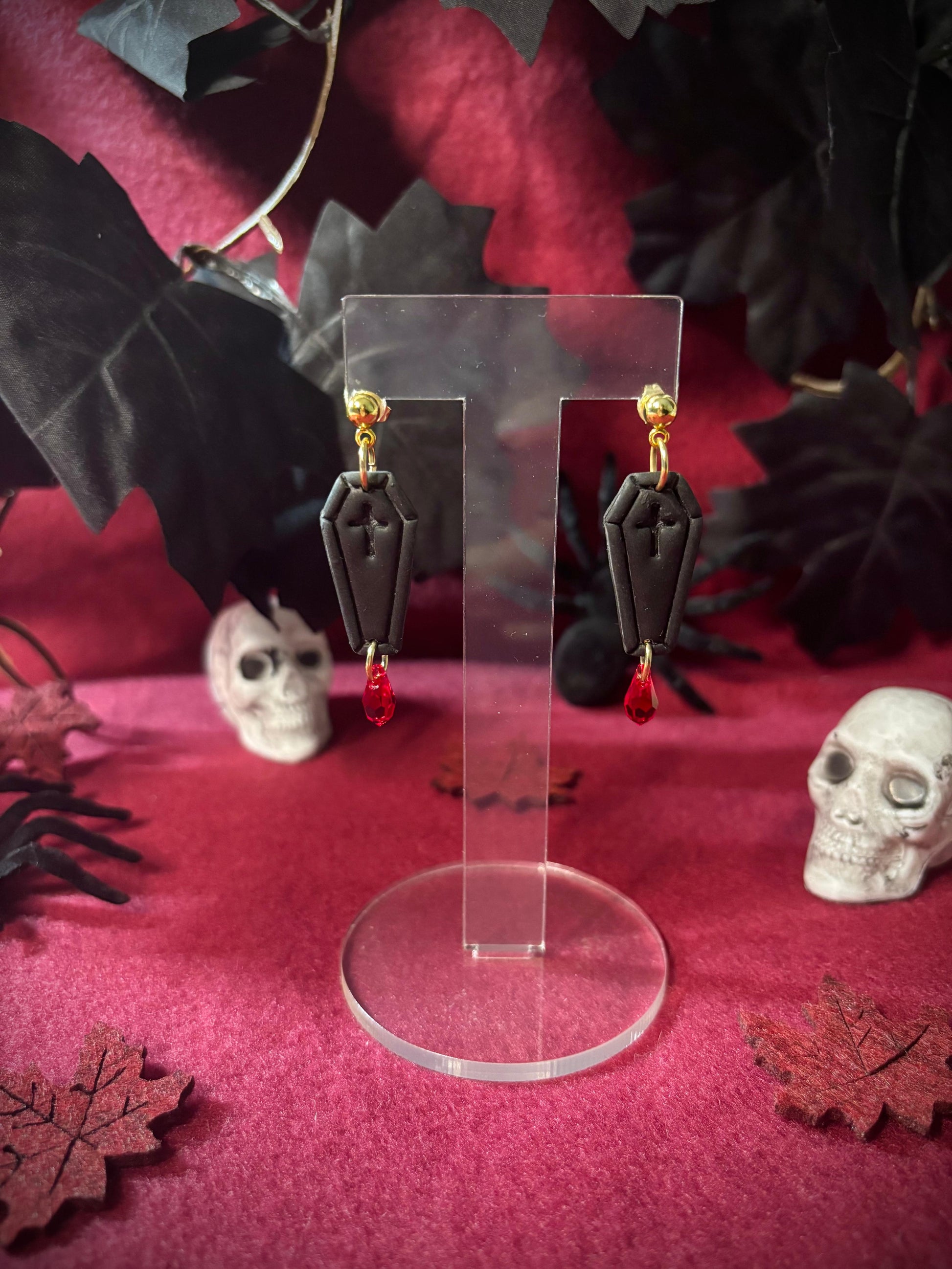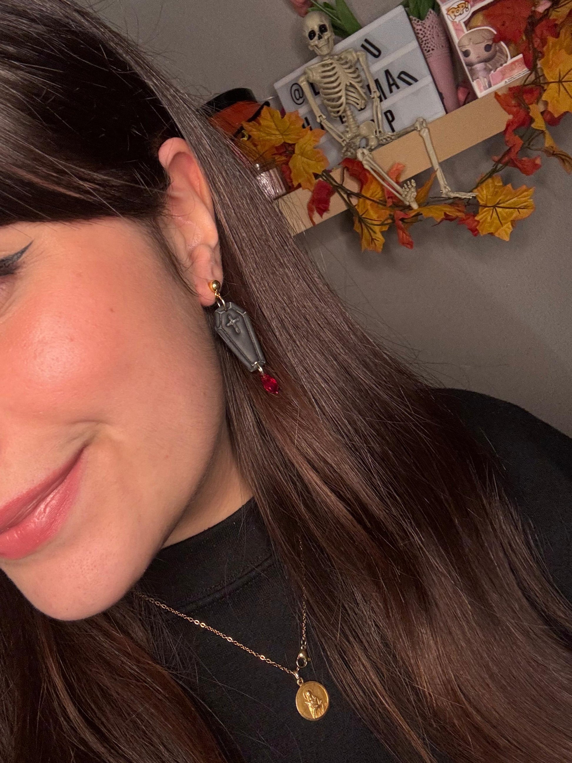 Pendientes hechos a mano con arcilla polimérica con un swa rojo.