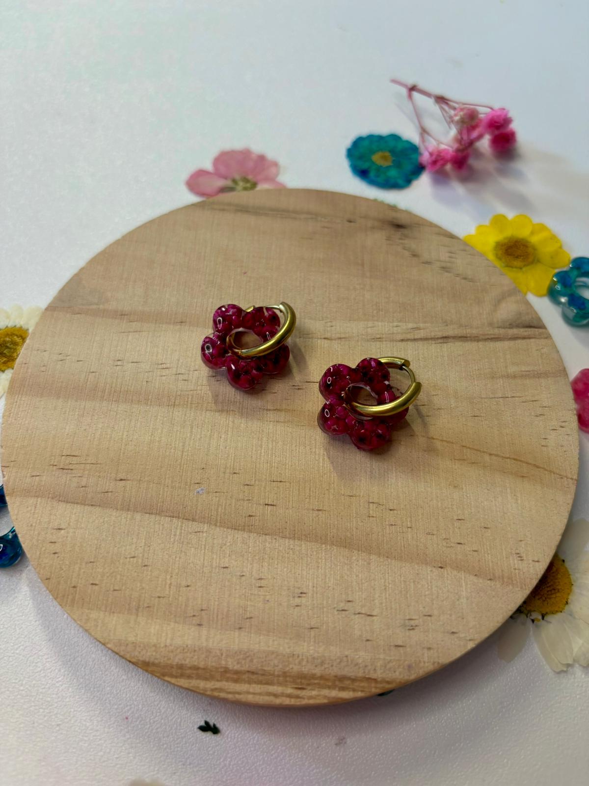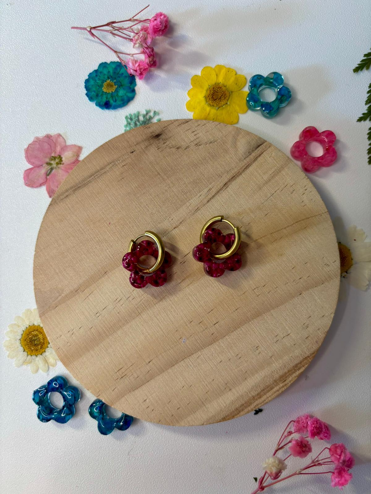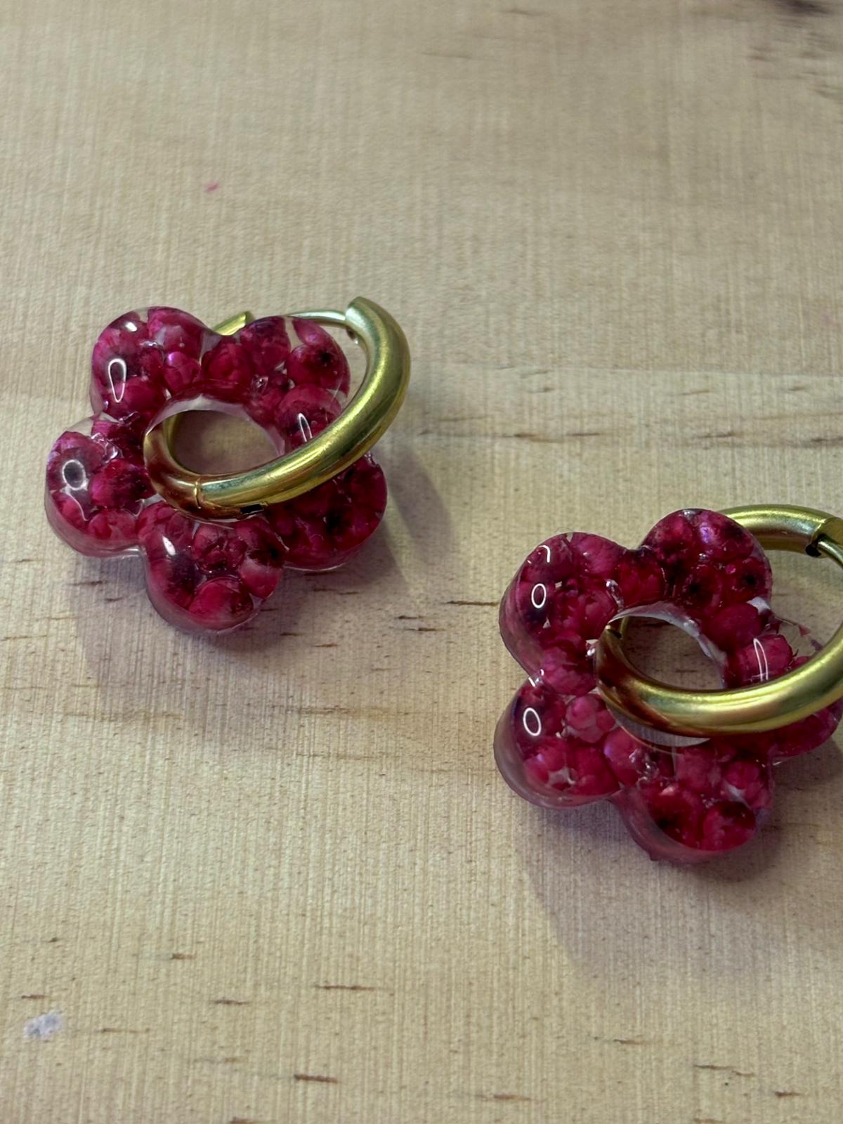 Pendientes hechos a mano de manera artesanal con flores secas preservadas y resina.