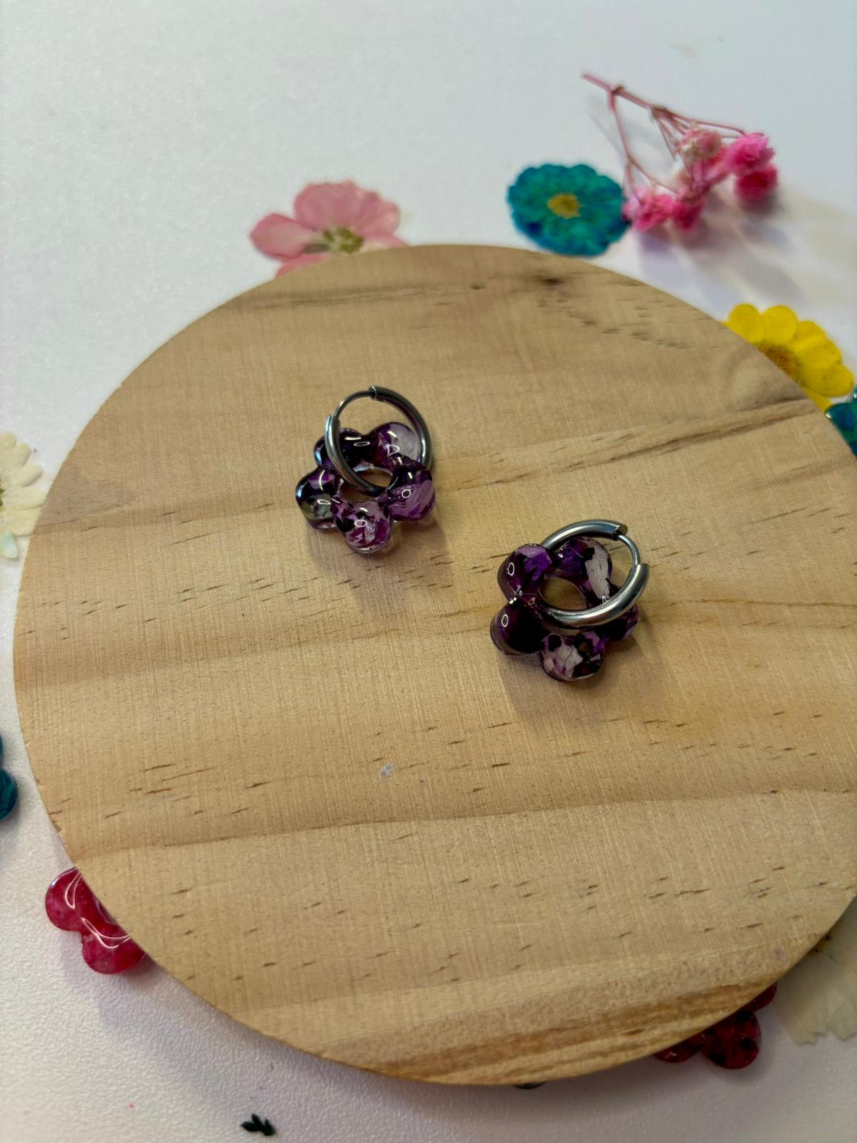 Pendientes hechos a mano de manera artesanal con flores secas preservadas y resina.