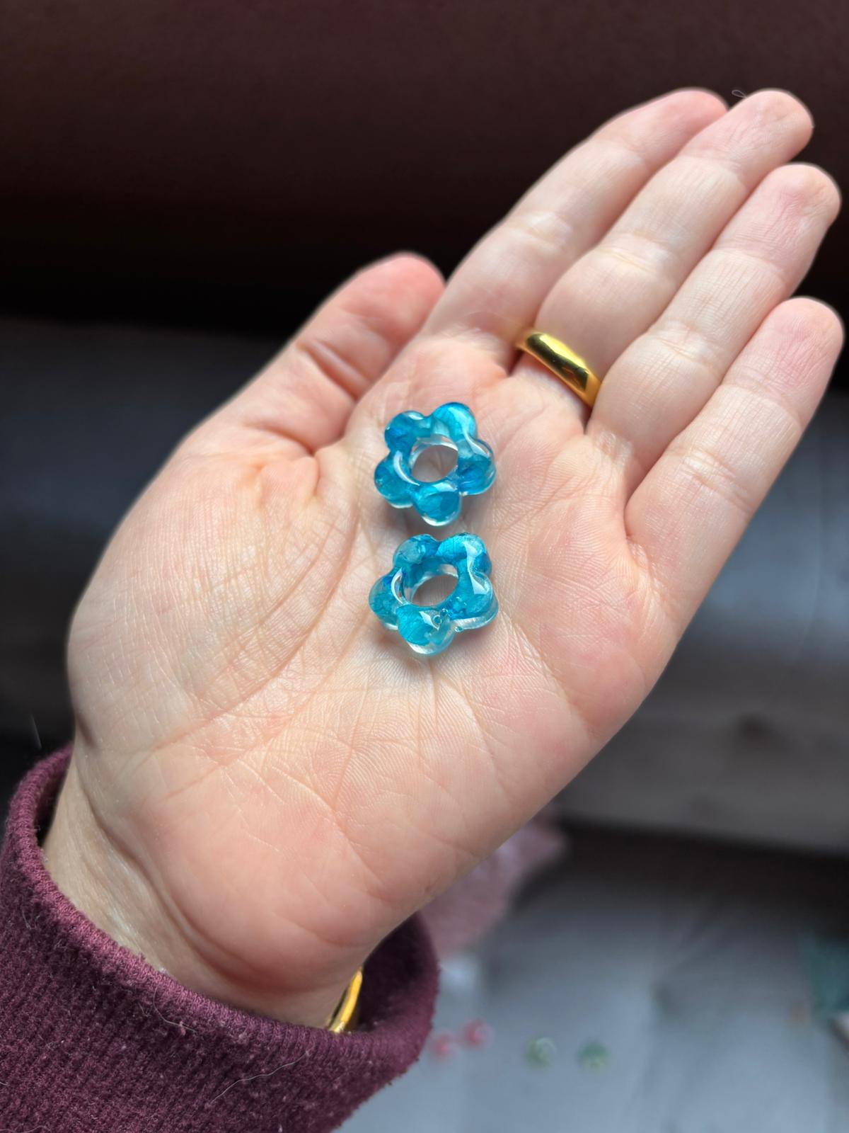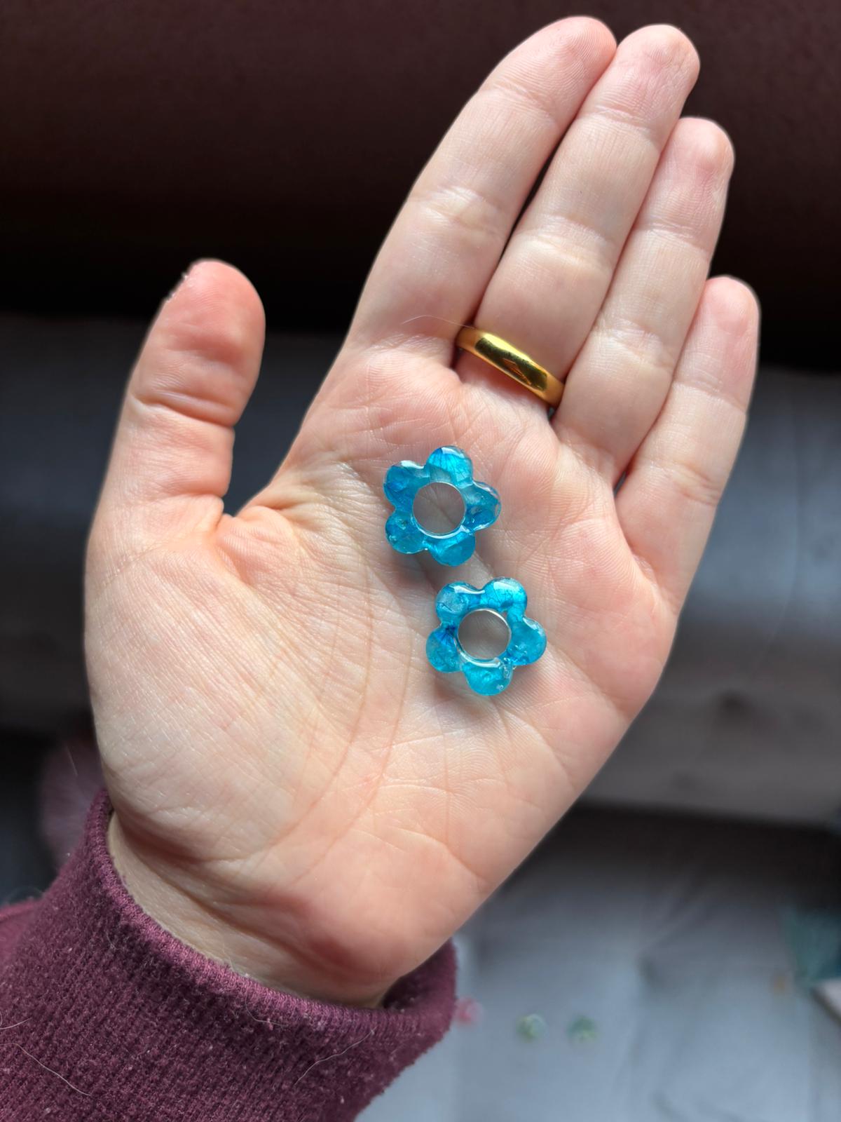 Pendientes hechos a mano de manera artesanal con flores secas preservadas y resina.