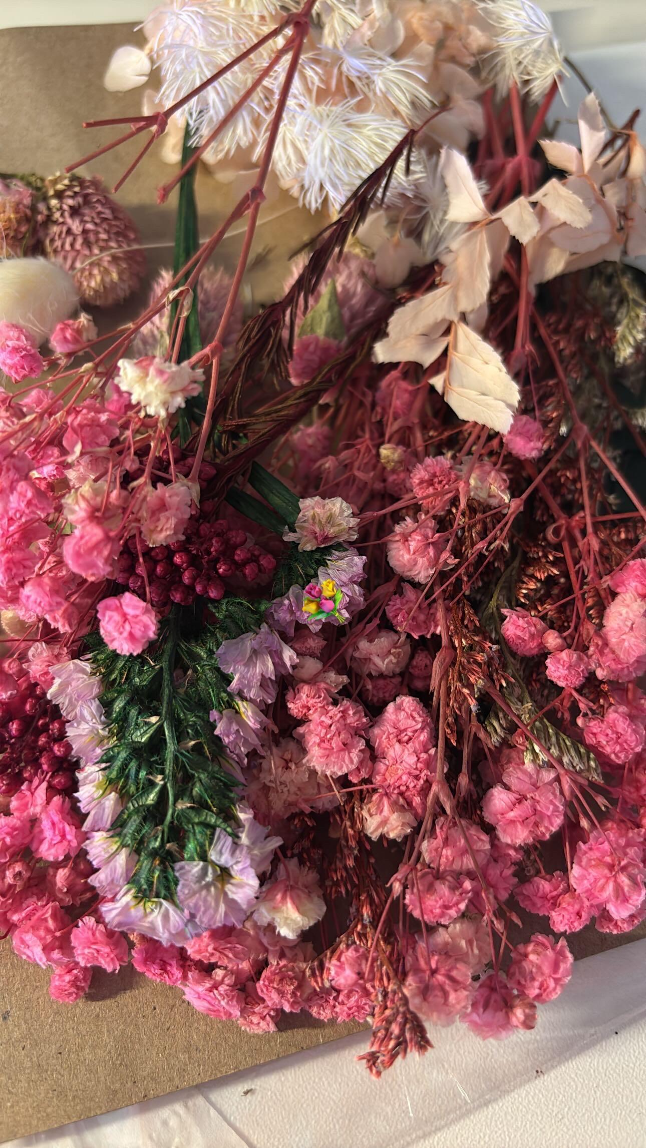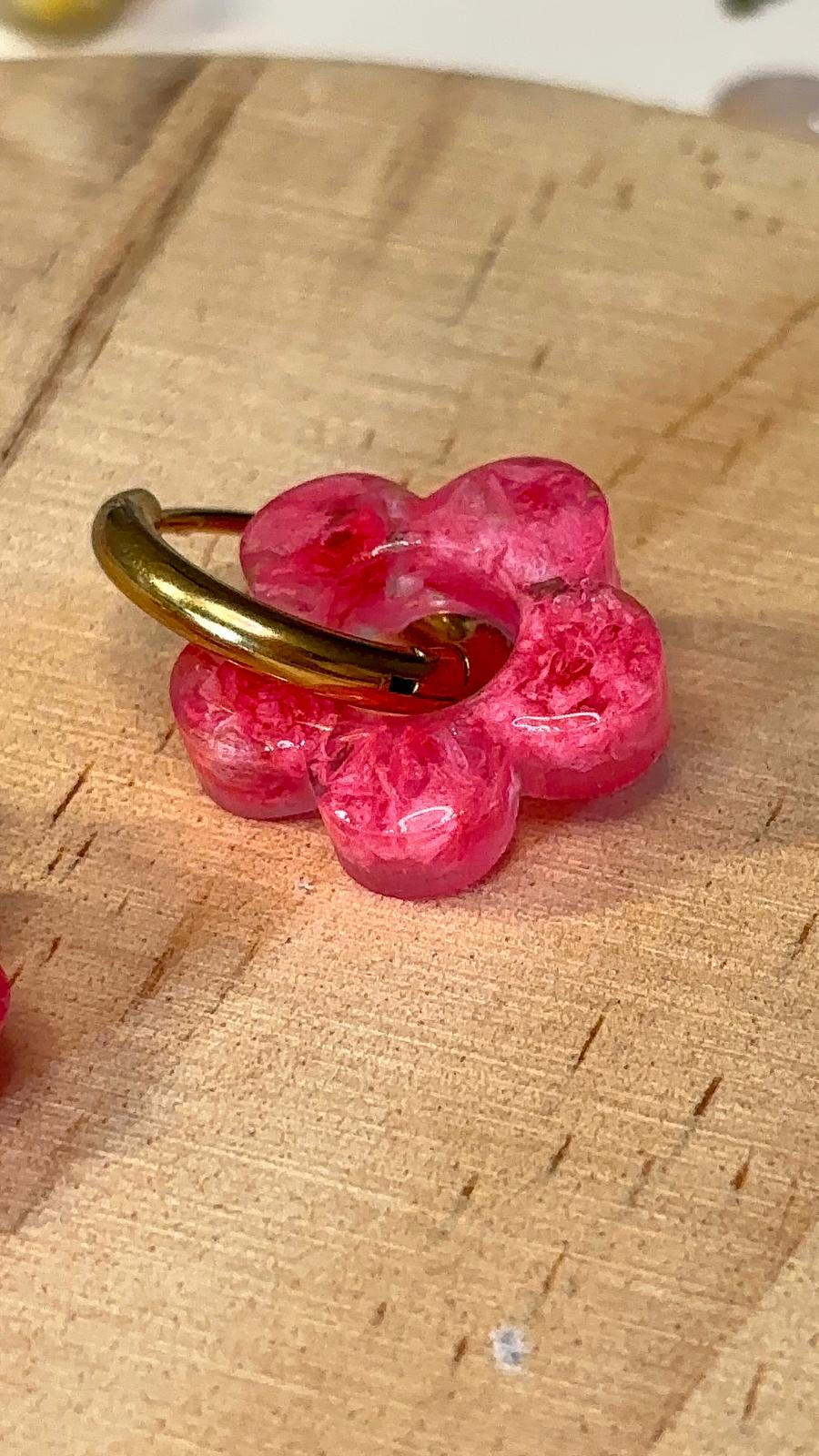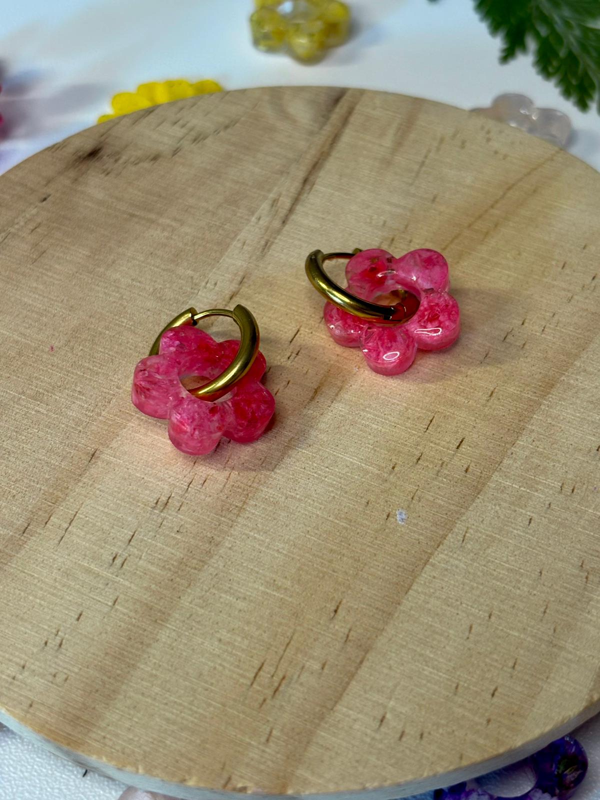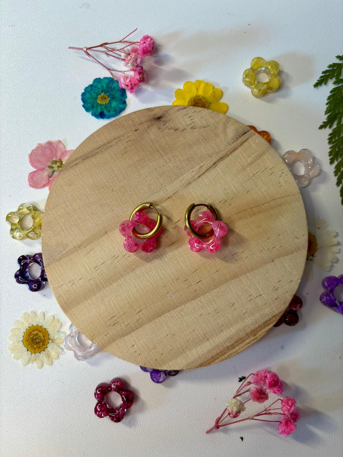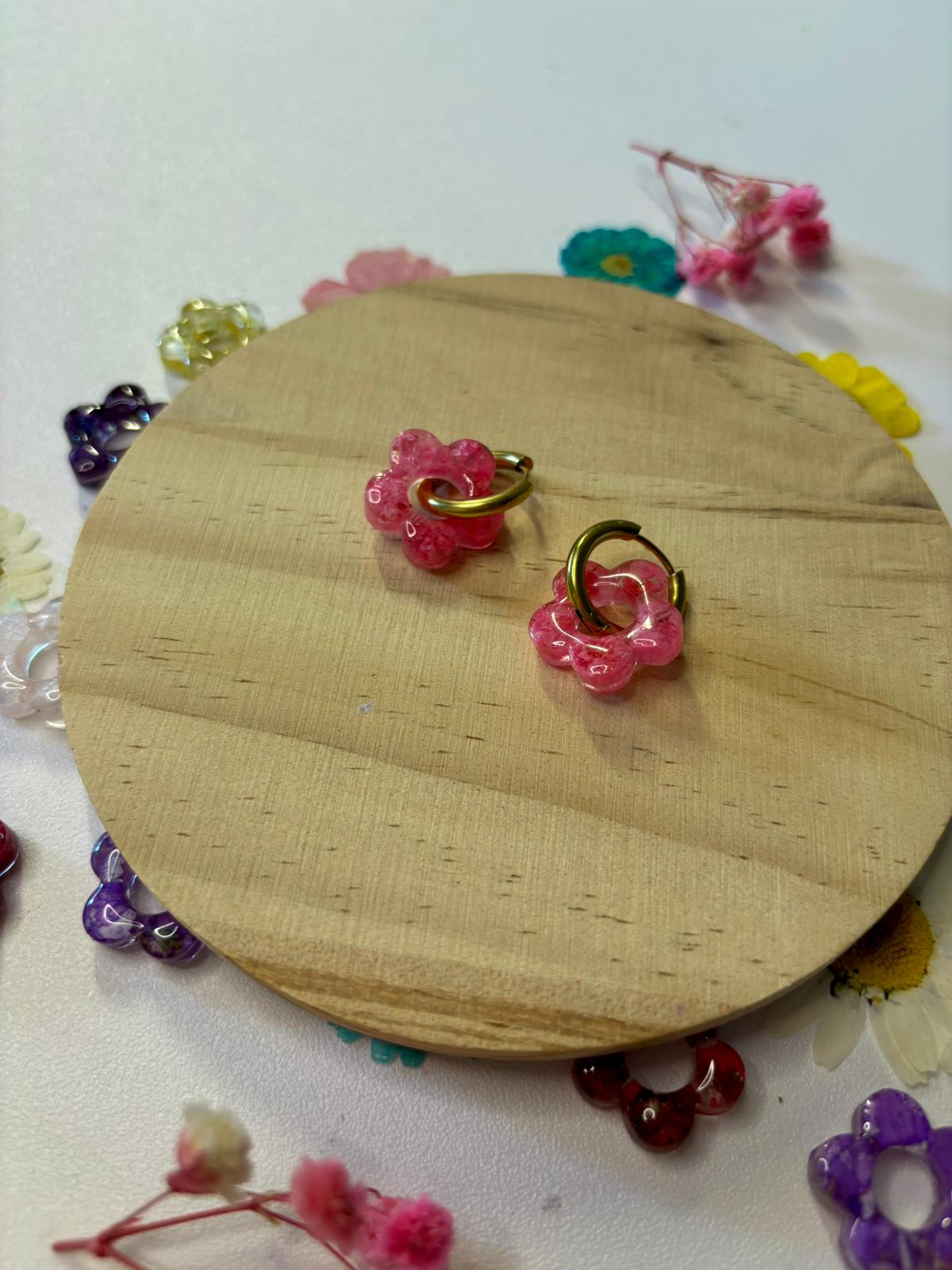 Pendientes hechos a mano de manera artesanal con flores secas preservadas y resina.