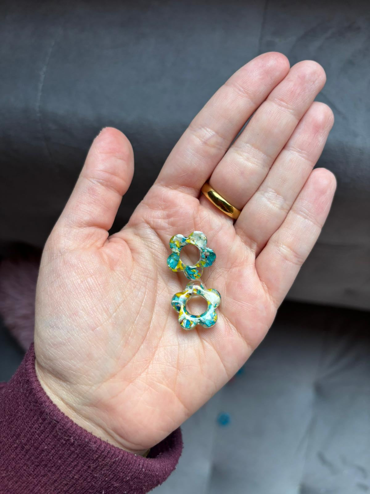 Pendientes hechos a mano de manera artesanal con flores secas preservadas y resina.
