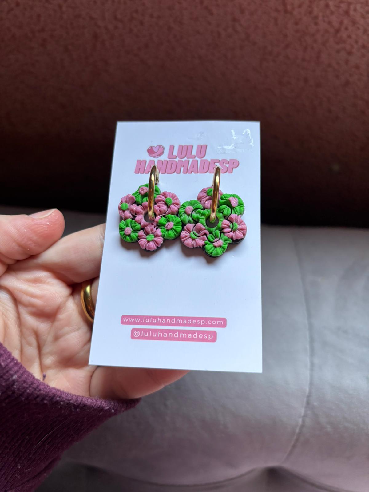 Estos pendientes están hechos a partir de una plancha de estampado creada a mano completamente, por lo que al cortar de la plancha los diferentes pendientes NO van a salir todos iguales. Las fotos del modelo son de referencia. Si tienes alguna preferencia específica como por ejemplo que tenga mas color rosa, apuntalo en notas del pedido en la medida de lo posible lo haremos realidad :)
